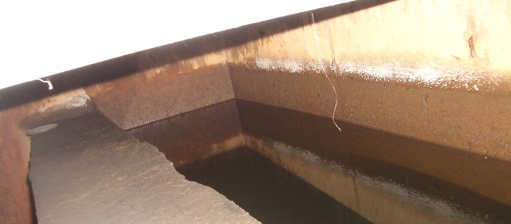 Photo 1 – looking down into the control structure ( a weir wall on the right holding back 6′ of standing water, a 6″ orifice direct below with the nasty stains seeping out.