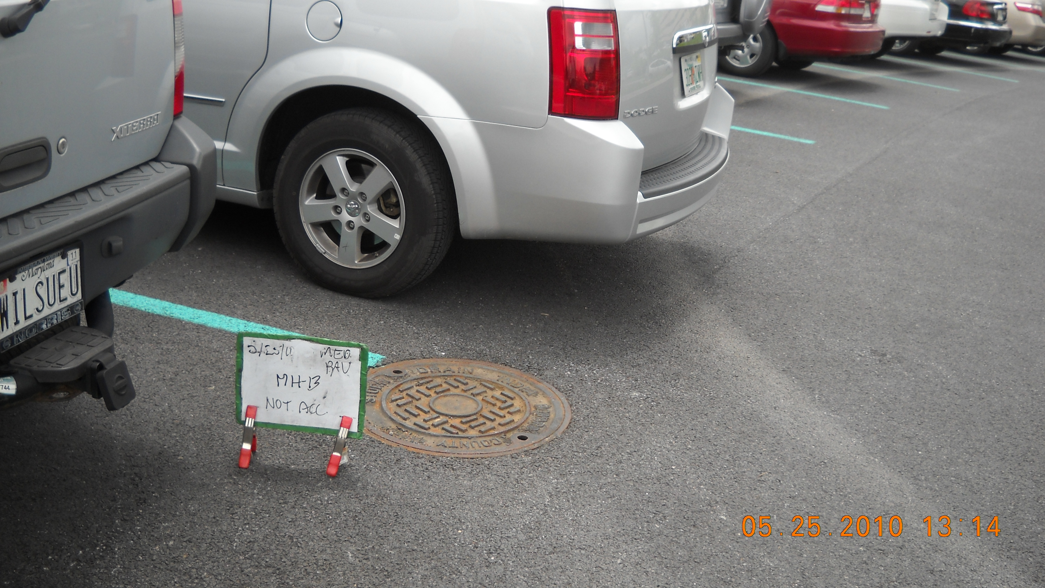 Typically, we open up all manholes and inlets during site inspections, but once in a while it seems like a better idea to just leave them alone. The license plate on the vehicle next to the manhole pretty much sums it all up!